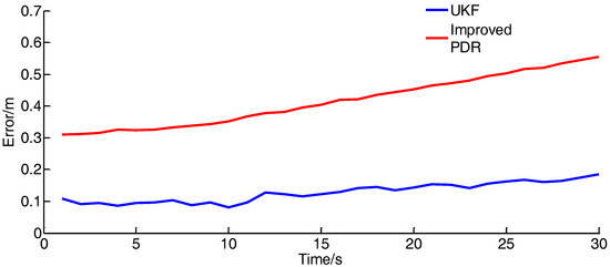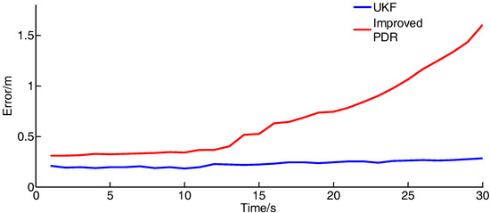 To verify the positioning accuracy of the method, the positioning error of the integrated positioning method and the improved PDR method are compared under the dynamic positioning, as shown in Figure 21: