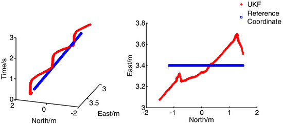 In Figure 14, the solution trajectory after UKF fusion is represented by green points with a positioning accuracy of 10–15 cm. At the same time, it can be seen that the dynamic performance is greatly improved compared with the single UWB. The specific dynamic verification is introduced in the next section.