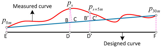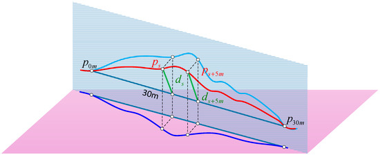 According to the railway standards [8,9], the alignment and level are measured by the vector distance value with a chord of fixed length (e.g., 30 m) on the rail surface in the horizontal and vertical directions respectively. The magnitude of alignment and level irregularities will be calculated by differential method of 30 m chord. As shown in Figure 2, the red curve represents a segmentation of railway track in 3-dimensional space; the other two curves are the projections in horizontal plane and vertical plane respectively. The 30 m long chord is determined by points and on the curve. Take the point on the curve as an example. The distance from to the chord is the vector distance of this point represented by . Vector distance of the next adjacent point with 5 m interval is . The track irregularity of point can be calculated by Equation (1) [8]: