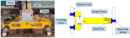 The track irregularity measurement system is illustrated in Figure 3. The system is equipped with a T-type trolley, a track gauge sensor, a high precision prism, an odometer, and a navigation grade IMU. The IMU consists of three high accuracy ring laser gyros (RLGs, bias instability: 0.01°/h and angular random walk (ARW): 0.005) and three high stability quartz accelerometers (bias instability: 50 and random noise: 10 ). The prism mounted on the trolley is used to provide position observations worked with a Leica optical total station (1 mm and 0.5″) based on control points. The odometer of the system can be used as an aid to determine the position of the irregularity measurements along the track in this paper. The gauge sensor is used to measure the gauge of the tracks.