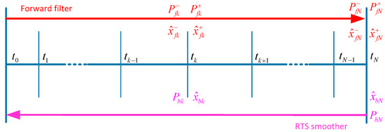 The position errors and their covariance between two observation updates will increase with time caused by the residual system errors. It is even more serious for the situations that the observation is few and not much precise. In order to obtain optimal position estimations during the updates outages, a smoothing algorithm must be applied utilizing all the past, current and future measurements [11,12]. This paper employs the well-known RTS smoothing algorithm to estimate the states in the measurement intervals. The RTS smoother consists of a common forward Kalman filter and a backward smoother. The backward sweep begins at the end of the forward Kalman filter. Figure 5 illustrates the computation procedure of the RTS smoother.