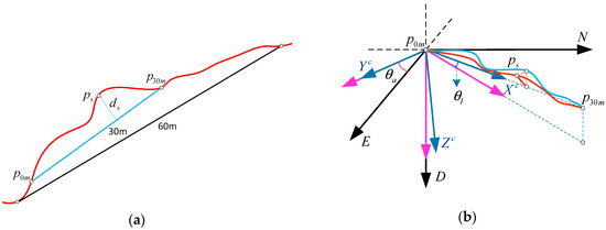 As shown in Figure 6, the track segmentation is 60 m long for ZUPT and absolute position update. For arbitrary 30 m chord on the track segmentation, we define a new frame as -frame, whose x-axis is identical with the chord and can be obtained by a rotation about z-axis and a rotation about y-axis of -frame sequentially. We can calculate the vector distance values for every point of a trajectory by transforming the coordinates from -frame to -frame. The relationship between -frame and -frame can be written as Equation (13):