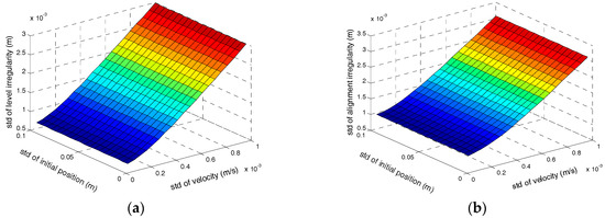 (a) The relationship between level irregularity and accuracy of velocity observation as well as initial position; (b) The relationship between alignment irregularity accuracy and accuracy of velocity observation as well as initial position.