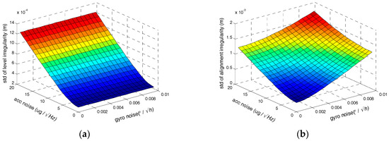 (a) The relationship between level irregularity measurement accuracy and noises of gyro and accelerometer; (b) The relationship between alignment irregularity measurement accuracy and noises of gyro and accelerometer.