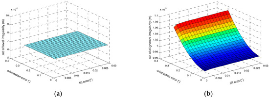 As illustrated in Figure 10, the attitude errors have no effect on the level irregularity, which is coincident with the theoretical analysis as Equation (30) shows. Since the orientation error is much bigger, it has a larger effect on alignment irregularity than the tilt errors.