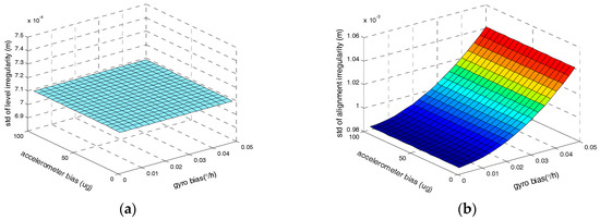 As illustrated in Figure 11, the gyro biases have no effect on the level irregularity, which is coincident with the theoretical analysis as shown in Equation (30) and the influence of the accelerometer bias on the level irregularity is small. In addition, the accelerometer bias has no effect on the alignment irregularity as well as Equation (29) shows.