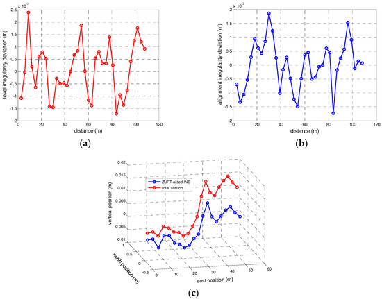 The first experiment is the comparison test of accuracy between the proposed approach and the total station. For this group of tests, the trolley stops at every 60 m distance interval and the velocity observation provided by ZUPT will be updated for the INS. The track irregularities measured by ZUPT-aided INS will compared with the measurements provided by total station. Since the high precise position measurements are measured by total station in every 3 m interval, the distance of two adjacent points calculating the irregularity in Equation (1) is chosen as 6 m. For 30 m chord, the deviation of measurement results between these two approaches is shown in Figure 14. As illustrated, the RMS of alignment irregularity is about 0.82 mm and level irregularity is 1.02 mm. The 3D spatial trajectories of first 60 m track segmentation measured by total station and ZUPT-aided INS are illustrated in Figure 14c. As shown in the figure, even though the absolute deviations between these two approaches are bigger, the relative deviations can still achieve millimeter scale.