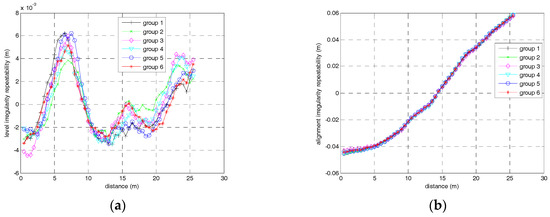 (a) Level irregularity measurement repeatability for 30 m chord; (b) Alignment irregularity measurement repeatability for 30 m chord.