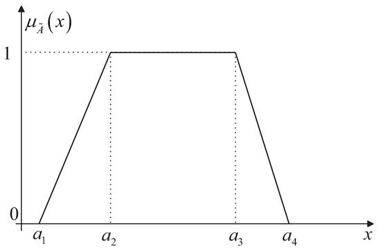 where x is a real number and there definitely exists an element such that . Triangular and trapezoidal fuzzy numbers are the most widely used fuzzy numbers, and the former can be regarded as the special case of the latter. A trapezoidal fuzzy number is usually denoted as , as graphically shown in Figure 1, which has the following membership function