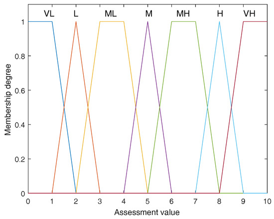Supposing each evaluation in decision matrix M shown in Equation (11) is defined on a set of linguistic variables in which every linguistic variable is represented by a trapezoidal fuzzy number given in Table 4 and graphically presented as Figure 2.