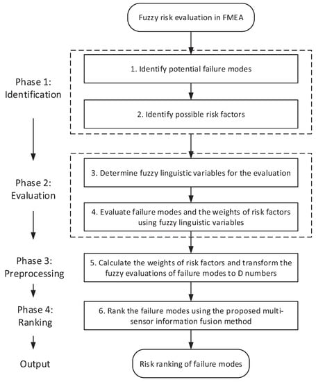 In terms of the multi-sensor information fusion method based on D numbers as presented above, a novel model for fuzzy risk evaluation in FMEA is proposed in this section. The flowchart of the proposed model is shown in Figure 3, which briefly contains four phases, namely identification, evaluation, preprocessing and ranking. The final output is the risk ranking of potential failure modes.