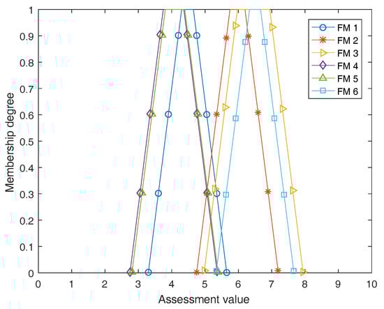 Thirdly, by using the PPT, we have: , , for FM 1; , , for FM 2; , for FM 3; , , , for FM 4; , , , for FM 5; and , , for FM 6. Fourthly, these pignistic probabilities are then transformed to fuzzy aggregated evaluations according to Equations (21) and (22) which are