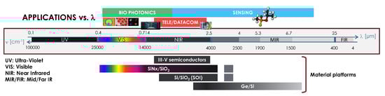 - Soref, R. Mid-infrared photonics in silicon and germanium. Nat. Photonics 2010, 4, 495–497. [Google Scholar] [CrossRef]