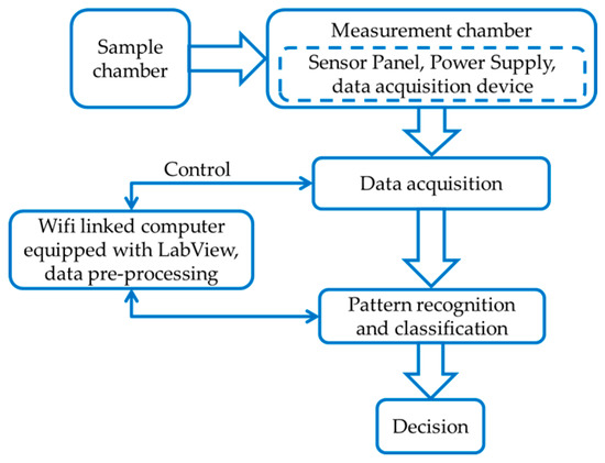 An E-Nose designing process has three main steps: (i) designing the sample and measurement chambers; (ii) data pre-processing; and (iii) classification and decision mapping. A block diagram of the design process is shown in Figure 1. The object under test was kept into the sample chamber, and the sensor array and data acquisition device were placed into measurement chamber. LabVIEW, and data processing and classification algorithms were installed in a Wi-Fi-connected computer to control the acquisition device, store data, pre-process the stored data to prepare signature patterns for training a classification algorithm, and classify odor data. The computer contained an Intel core i5 processor, 4 Gb random access memory, and ran with a 64 bit Windows 7 operating system. The outputs from the classification algorithm were mapped to the corresponding decisions set by the designer.
