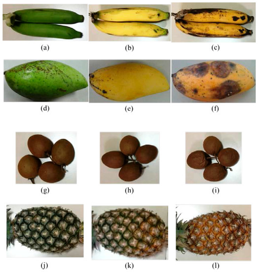 Figure 2. Fruit samples at different ripeness states: (a) unripe banana; (b) ripe banana; (c) rotten banana; (d) unripe mango; (e) ripe mango; (f) rotten mango; (g) unripe sapodilla; (h) ripe sapodilla; (i) rotten sapodilla; (j) unripe pineapple; (k) ripe pineapple; and (l) rotten pineapple.