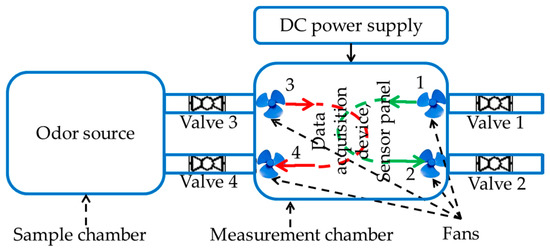 Figure 4. The E-Nose experimental setup. Valves 1 and 2, and Fans 1 and 2 are for air flow control, Valves 3 and 4, and Fans 3 and 4 are for circulating the odor between sample chamber and measurement chamber. A DC power supply powers the sensors, fans, and the data acquisition device. In the figure DC stands for direct current.