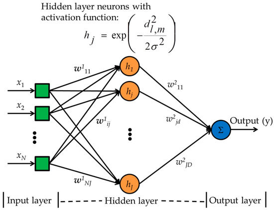 The design of a supervised RBFNN [18,19,20,21,22] is similar to the GRNN. However, the weights from the hidden layer neurons to the output neuron, w2, are not the true targets, but are initialized to small random numbers when the training begins, and are updated to optimal values during the training phase to reduce output error. The RBFNN algorithm is presented below.