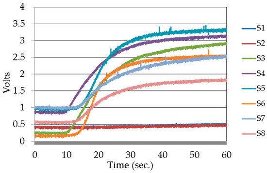 Figure 7. Time versus voltage responses of eight sensors to rotten sapodilla. S1 to S8 are sensor labels as listed in Table 1.
