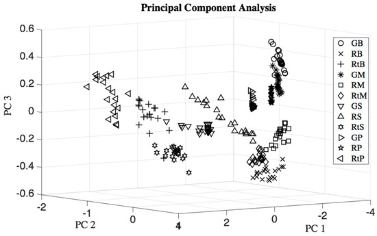 Figure 8. Three dimensional principal component analysis (PCA) scores plot of four types of fruits each at three ripeness states: GB = green banana, RB = ripe banana, RtB = rotten banana, GM = unripe mango, RM = ripe mango, RtM = rotten mango, GS = unripe sapodilla, RS = ripe sapodilla, RtS = rotten sapodilla, GP = unripe pineapple, RP = ripe pineapple, and RtP = rotten pineapple.