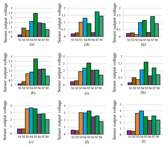 Figure 9. Signature patterns of the means of three types of fruits at three ripeness states: (a) green banana; (b) ripe banana; (c) rotten banana; (d) green sapodilla; (e) ripe sapodilla; (f) rotten sapodilla; (g) green pineapple; (h) ripe pineapple, and (i) rotten pineapple.