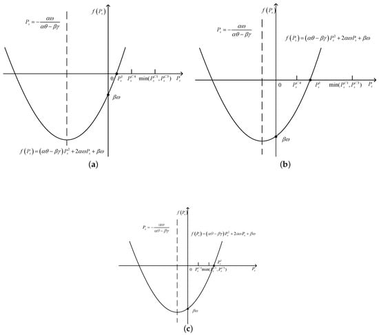 From Labels (22)–(24), we can find that, for , is a monotone increasing function of , and, for , is a monotone decreasing function of . Meanwhile, we also should consider the constraint as above. Then, if , ; otherwise, .