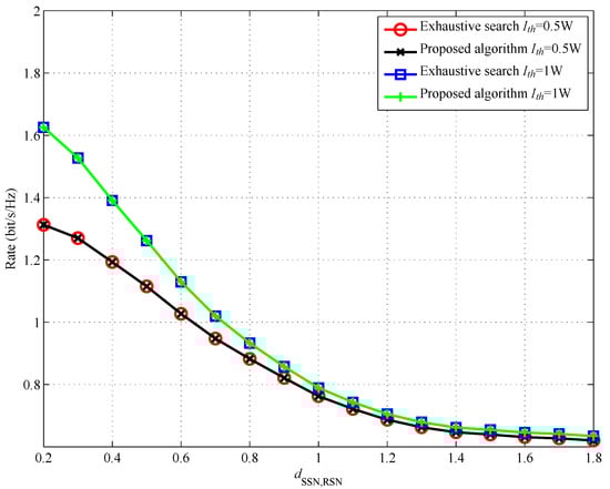 Figure 5 shows the achievable rate of the cognitive sensor system versus . It can be observed from Figure 5 that there is no performance gap between our proposed algorithm and the exhaustive search method. In Figure 5, we can find that the achievable rate becomes larger when RSN moves closer to SSN, which is due to the fact that when RSN is located closer to SSN, it can harvest more power in the first slot to help forward SSN’s signal to DSN in the second slot. We can also observe from Figure 5 that, with larger , SSN can achieve a larger rate. This is because, with a larger , PR can tolerate a larger interference from the cognitive sensor network. Then, SSN and RSN can use more power to transmit the signal, which can be illustrated in Figure 6 and Figure 7.