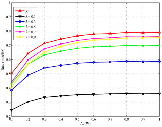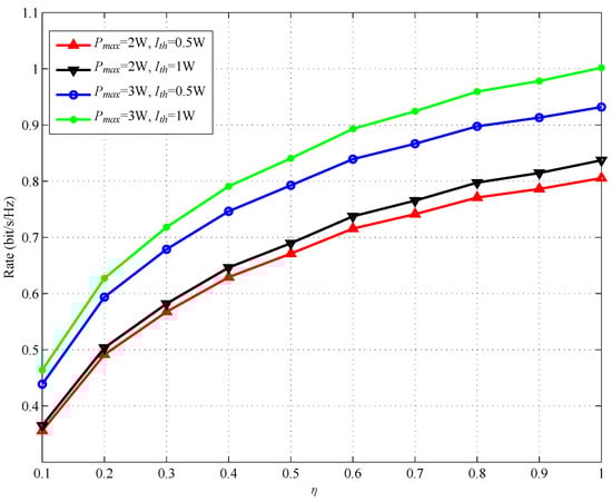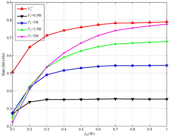 Figure 8 shows the achievable rate versus with different and . The distance between SSN and RSN, , is set to be 1. In Figure 8, we can find that the achievable rate increases with the . This is due to the fact that, with larger , RSN can harvest more energy to help forward the SSN information, which leads to a larger achievable rate at DSN. Figure 9 shows the optimal versus with different . The interference threshold is set to be 1 W. It can be observed from Figure 9 that decreases with the increase of . Then, RSN can use more energy to forward SSN information, which also illustrates a larger achievable rate as shown in Figure 8.