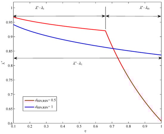when , as shown in Figure 4c, we can obtain , , is a monotone decreasing function of . Thus, when , obtains the maximum value. Thus, the optimal value of can be obtained as