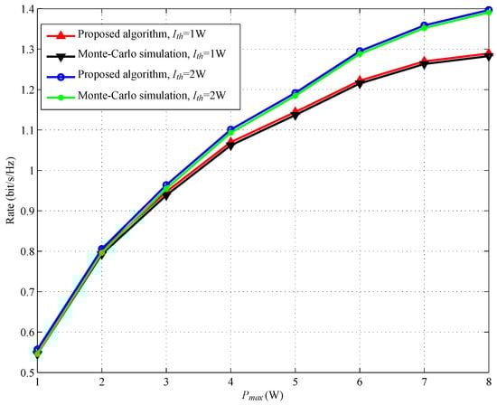 Figure 10 shows the achievable rate versus with different . It can be observed from Figure 10 that the performance gap between the proposed algorithm and Monte Carlo simulation is very small, which illustrates the approximation in Label (5). We also can observe from Figure 10 that the achievable rate increases with the maximal SSN transmission power .
