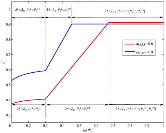 Figure 11 shows the optimal versus with different . The maximal transmit power of SSN, is set to be , the PT transmission power . It can be observed from Figure 11 that becomes larger with the increase of . When is sufficiently small, and we can find that , and , . As increases, becomes larger, when , we can find that , , and linearly increases with the increase of . However, when reaches a certain level, becomes to be a constant, which equals .