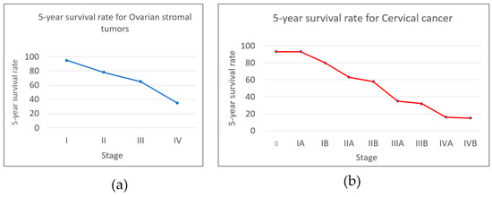 Graphs plotted between 5-year survival rates versus stages of cancers. It is clear that at the initial stage of cancer development, patients have significantly larger chances of being cured. (a) Ovarian stromal tumor [5], (b) Cervical cancer [6].