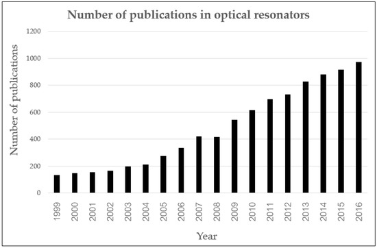 Figure shows how the number of articles on fix in figure label optical resonators evolved between 1999–2016. The graph shows increasing trends in this area of study. Remark: The data were gathered from the Web of Science database (www.web of knowledge.com) with the keyword “Optical Resonator”, and then the category filter “Optics” was applied [19].