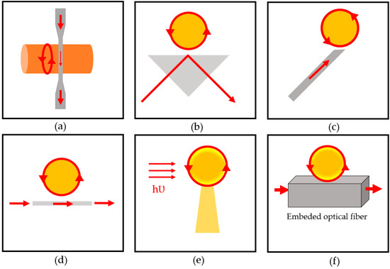 Optical resonators mostly consist of two optical waveguide structures: the first serves the system as an input and output waveguide, where light enters and the signal is detected at the other end. The other structure is the resonator structure, which confines the light propagated from the first structure. There are various techniques for coupling the light, the most common being tapered coupling. Examples of methods for illuminating resonator structures (Figure 3) include tapered coupling [42], prism coupling [43], angled fiber coupling [44], planar waveguide side coupling [39,45,46], free-space coupling or direct illumination [47,48], and polished half-block coupler [49].