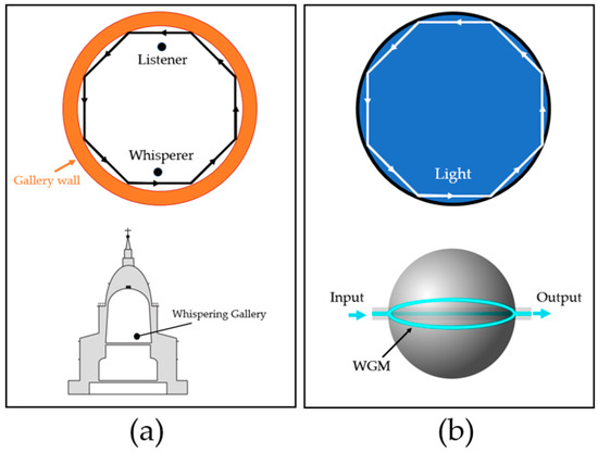 Comparison of mechanical wave and electromagnetic wave WGM. (a) Diagram shows how WGM occurs: sound travels from one side of the gallery to another in the structure of St. Paul’s Cathedral where WGM was first observed; (b) WGM of light: light is totally internally reflected within the small curved cavity [54,75]. The phenomenon can be observed as light trapped inside the spherical structure [76].