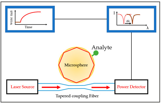 Example of microsphere configuration. Shown is an example of a microsphere with tapered coupling. The microsphere utilizes the WGM principle to resonate light inside its cavity. The analyte binding on the microsphere surface causes the change in the refractive index. The resonant wavelength is also shifted as a result.