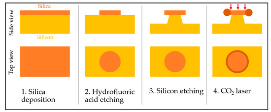 Microtoroids, on the other hand, were invented to address the signal lost problems of ring resonator. Even though, microtoroids are WGM-based optical resonator, the device is fabricated on a chip like in microring resonator fabrication. The microtoroid structure is raised above the substrate by the post, preventing any leak from evanescent scattering to the substrate [110]. As a result, a high Q-factor can be observed, with values up to 108 [23]. Microtoroids can be fabricated using lithography, reactive ion etching, and xenon difluoride (XeF2) etching. Hence, an array of microtoroids can be fabricated. The fabrication process is as follows: The resonator substrate, SiO2, is deposited on a silicon substrate. Then, etching is used to create the SiO2 disk. The post is created by removing the substrate below the disk via XeF2 isotropic etching. Finally, the CO2 laser illuminates the structure, and the edge of the disk melts and forms a smooth toroid aided by surface tension [29,111,112] (Figure 8).