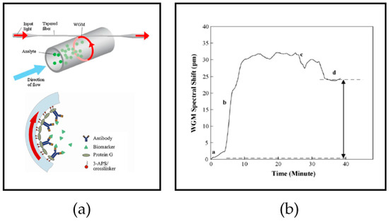 Analysis of HER2 biomarker. (a) OFRR schematic. The cross-section diagram visualizes the layer of the OFRR inner core surface; (b) spectral shift at (a) buffer flow, (b) sample flow, (c) sample binding and (d) buffer washes. Reprinted with permission from [138].