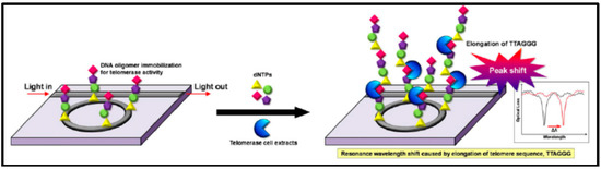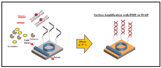 In 2014, Shin et al. [25] developed the ISAD system with DMP to improve specificity. Their aim was to detect mutated epidermal growth factor receptor (EGFR), the biomarker of non-small cell lung cancers (NSCLCs). The sensor was fabricated similarly to a typical silicon microring resonator. Then, DMP primer was immobilized on the surface. The microring was incubated overnight in the amine-modified DMP primer in 1 PBS. A small acrylic chamber (1.5 cm × 0.7 cm × 2 cm) was used to confine the detection area (Figure 10).