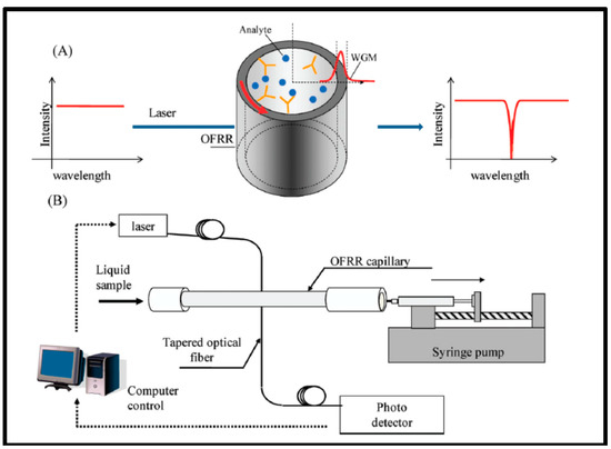 OFRR is also a ring resonator configuration. The resonator is used to overcome the disadvantage of low Q-factor in microring resonators and the low reproducibility of microsphere resonators [116]. The OFRR uses a microscale SiO2 capillary with a diameter in the range of hundreds of micrometers. However, the wall thickness can be thin, i.e., <4 μm. This can be considered a parallel microring resonator combined with the fluidic channel. Fiber manufacturing methods are equipped to fabricate such resonators, and reproducibility is enhanced due to the qualified manufacturing process [117], such as capillary pulling or fiber pulling tower. The resonator structure is then conjugated with the coupling device. The Q-factor of such a device is in the 106 range, with a detection limit of 10−7 RIU.