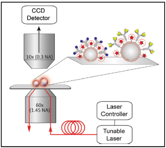 The multiple microsphere resonator system: the objective lens is utilized as the coupling waveguide, while two differently sized microspheres are paired with different receptors. CCD detects the fluorescence behavior of the system. Reprinted with permission from [136].