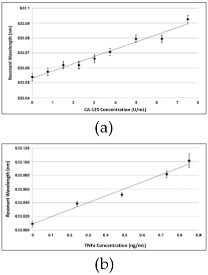 HER2 is overexpressed in the development of breast cancer. Presently, gene analysis involves a highly invasive method and labeled detection [11]. Therefore, less invasive and label-free analysis is gaining attention. HER2 is a transmembrane protein; its extracellular domain can also be detected in blood [15]. In 2010, an experiment was performed using an OFRR [138]. The resonator was a pulled SiO2 capillary with an outer diameter of 150 μm. The wall was chemically polished to reduce its thickness and to enhance sensitivity, and was reduced from 5 μm to 3 μm using hydrofluoric acid (HF). The resonator was coupled with a tapered SMF-28. The input laser had a wavelength of 1550 nm, with the photodetector on the other end of the tapered fiber. The sample was injected using a syringe pump at the rate of 1 μL/min. The inner core was functionalized first by a layer of aminosilane. Then, double mismatched primer (DMP) crosslinker bound protein G with the layer. HER2 antibody was introduced as the bioreceptor. The HER2 sample was diluted in phosphate-buffered saline (PBS) to 0.1 mg/mL. After the analysis, a low concentration of HF was applied to the inner surface to remove the activated surface component. The sensor was then ready to perform further diagnosis. Figure 9 shows the setting and the results.