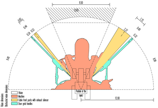 A frequently used group of theoretical methods is the analysis of the driver’s vision in CAD (Computer-Aided Design) programme systems. The basic prerequisite for such a procedure is the use of project documentation of the machine. These methods are fast and the application of design changes does not represent high costs as in the case of a machine in batch production. The driver’s field of vision can be analysed simply from different user-defined positions corresponding to the performance of various working operations, e.g., driving with a load or turning. Ryan et al. [12] analysed the driver’s field of vision during work operations with a hydraulic crane using a virtual model of human figures of different heights. Choi et al. [13] compared the driver’s field of vision determined by using a digital human body model with the methods of light point source and with individual visibility tests of six helpers. Gilad and Byran [14] evaluated the driver’s field of vision in three tractor models by using the innovated method of a virtual human body model.