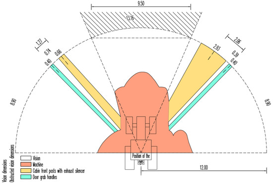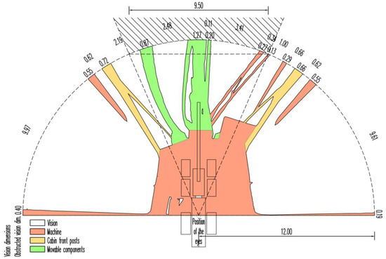 Semi-circular vision to the front of harvester driver determined by the TLS method. Note: dimensions are in m.