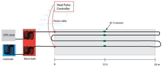 Soil moisture at point scales can be accurately measured using the gravimetric method and point-scale sensors, e.g., neutron probe, Time Domain Reflectometry (TDR), and heat-pulse sensors [1]. Upscaling these point sensor measurements to large scales is of great importance for hydrology and climate studies, but remains a significant challenge [2]. Several innovative techniques have been proposed to facilitate large scale soil moisture monitoring, e.g., cosmic-ray probes [3], GPS reflectometry [4,5] and distributed temperature sensing (DTS) e.g., [6,7]. Cosmic-ray probes and GPS reflectometry can only provide integrated soil moisture over large areas (approximately 700 m in diameter for cosmic-ray probe and 100 m for GPS reflectometry). Validating these techniques can be laborious and challenging due to the difficulty of upscaling point scale measurements. Several recent studies have demonstrated the feasibility of using DTS to provide cost-effective high-resolution soil moisture information over large areas [6,7,8,9,10,11]. DTS, therefore, has a potentially valuable role in bridging the observation gap from point-scale, to field-scale to satellite footprint scales. In addition to improving our understanding of soil moisture scaling, DTS may also be useful for combining or cross-validating measurements at different scales.