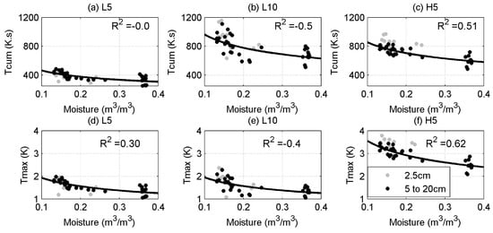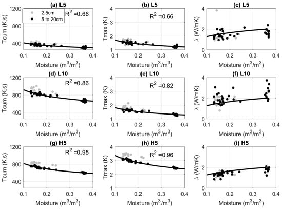 Using a shorter pulse but with higher input power (H5) leads to a significant increase in the values obtained compared to L5. The and methods yield comparable results in this case (Figure 4g,h). The higher power input also benefits the approach. The results are less scattered than the L5 case, producing a better-defined relationship between the estimated and soil moisture. The estimated relationship is also close to the independently derived moisture— relationship (Figure 4i). This is because starting the cooling phase at a higher temperature reduces the relative impact of measurement noise. Hence, the observations provide a better fit to Equation (3).