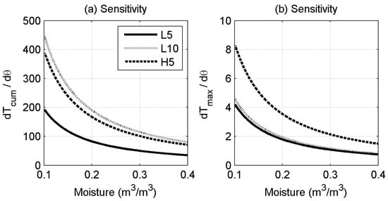 Figure 5 shows the influence of the heating strategy on the sensitivity of (a) and (b) to soil moisture. Since essentially measures the total undissipated energy, similar sensitivity can be achieved using the lower input power for a longer duration or using the higher input power for the shorter pulse for this approach. Figure 5b shows that for the approach, extending the heat pulse duration has no effect, while increasing the input power leads to increased sensitivity. Hence, if input power is the limiting constraint, the approach is preferable. However, it is also worth noting that, for the same (higher) power input, the yields marginally better results.