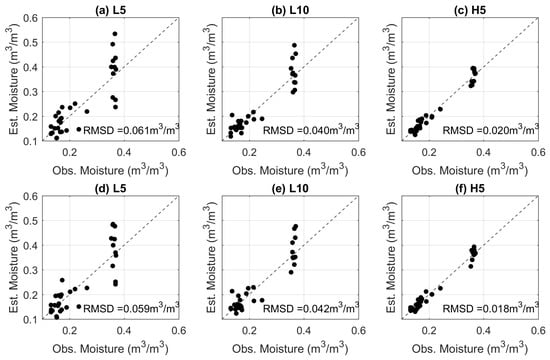 Comparison of the observed and the estimated soil moisture using the method (a–c) and method (d–f). Soil moisture measurements at 2.5 cm were not included.