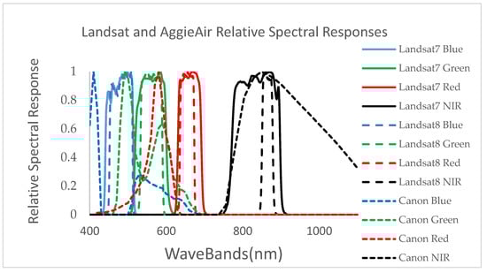 The visible camera used in the AggieAir flights is a Canon S-95 (with a 10-megapixel charge-coupled device (CCD) sensor with an International Standards Organization (ISO) range of 80–3200 []. NIR imagery was captured with the same camera modified to replace the manufacturer’s optical filter with a Wratten 87 NIR filter that allows NIR wavelengths of 750 nm and larger. The relative spectral responses of the VIS–NIR cameras were obtained using the algorithm provided by Jiang et al. []. AggieAir also carries a small, low-power, microbolometer thermal camera from Infrared Cameras Inc. (ICI) [] (Infrared Cameras Incorporated, 2012). The AggieAir and Landsat VIR spectral responses are shown in Figure 2.