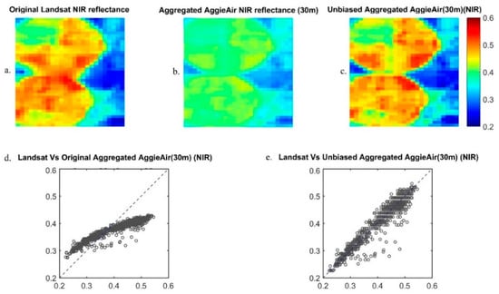 Figure 3a shows the original Landsat NIR band surface reflectance for 1 June 2013 over the study area, and Figure 3b shows the aggregated NIR band reflectance image from AggieAir. Figure 3c shows the unbiased AggieAir NIR reflectance image at 30-m resolution with histogram matching applied. Figure 3d,e demonstrate the effectiveness of this approach with pixel-level scatter plots of the original and unbiased aggregated AggieAir NIR band versus the corresponding Landsat NIR band at a resolution of 30 m.