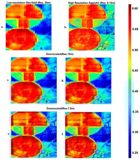 (a) Low-resolution observation (Landsat NIR); (b) high-resolution observation (AggieAir NIR); (c,e) downscaled NIR at 15 and 7.5 m resolution, respectively (first scenario); (d,f) downscaled NIR 15 and 7.5 m resolution, respectively (second scenario).